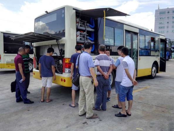 培訓當天,金旅客車廠工程師首先采用PPT詳細講解純電動車輛結構原理、車輛安全駕駛操作、日常維護保養及應急預案等課程,再通過基礎理論結合現場實操培訓,強化從業人員日常維護能力和操作水平。培訓學習結束后,為進一步鞏固成果,該站還組織了實操考試,64名參訓學員均順利通過考試。