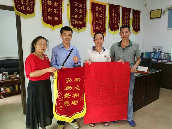 10月14日,陳伯兩夫妻將一面寫有“熱心相助 弘揚美德”的錦旗,交到了江門市公共汽車有限公司駕駛員林宇光、施瑞堂的手中,感謝他們熱心救助陳伯的義舉。