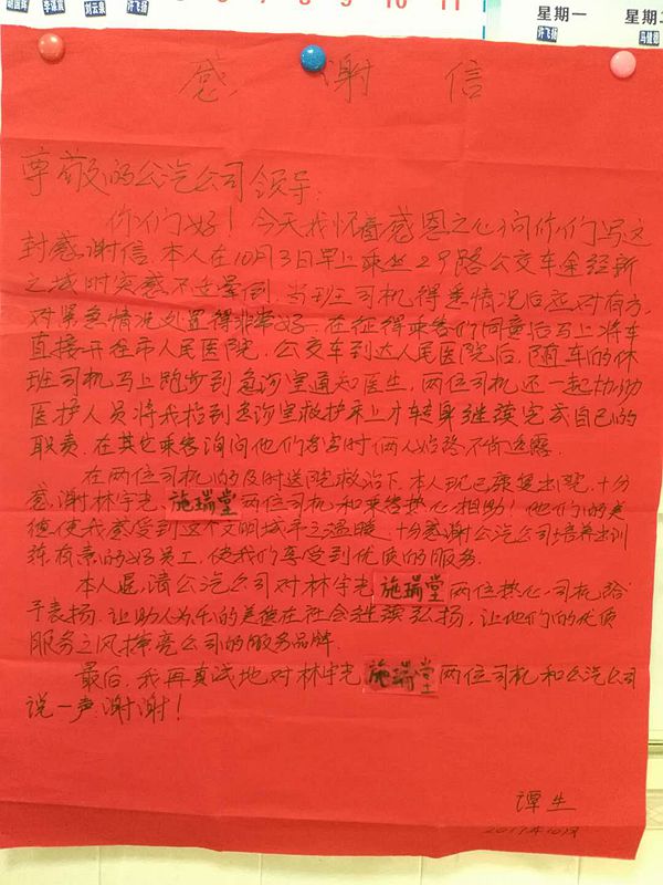 事情要從10月3日說起。當天,11時左右,陳伯兩夫妻在蓬江區杜阮鎮搭乘29路公交車,行至建設路附近時,陳伯突然暈倒。當班駕駛員林宇光和正在乘車上班的駕駛員施瑞堂發現后,覺得情況緊急,他們第一時間想到的是趕緊送醫院救治。于是,兩人先向車上其他乘客說明原因,隨后,立即打開警示燈將車開往附近的市人民醫院。公交車抵達市人民醫院,兩位駕駛員把陳伯背下車,送進急診室后才離開醫院。陳伯家屬表示,醫生說陳伯當時是因缺氧暈倒,經住院治療后,陳伯已無大礙。