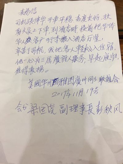 表揚信由美國華州西雅圖廣州同鄉聯誼會會長梁先生和副理事長彭先生聯名撰寫。信中高度評價市汽運集團公司開平汽車總站駕駛員張偉華,贊揚他駕車安全平穩,態度熱情有禮,沿途主動照顧年邁的嘉賓上下車,并親自幫助乘車嘉賓把行李送至下塌的酒店。張偉華高度的責任心和誠懇服務態度得到嘉賓的高度贊譽,也向參加本次盛會的世界廣府人展現了江門汽運人的風采。