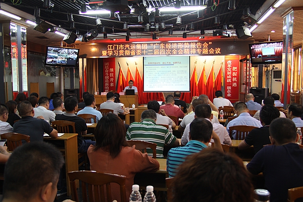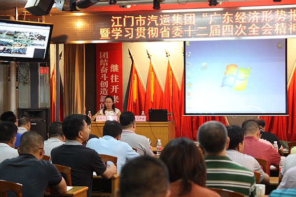 為深入貫徹落實黨的十九大和習近平總書記重要講話精神,全面準確把握當前經濟形勢,深刻領會省委十二屆四次全會的決策部署,以新擔當新作為推動當前各項工作,2018年7月6日上午,江門市汽運集團黨委舉辦廣東經濟形勢報告會暨學習貫徹省委十二屆四次全會精神專題會議。考慮基層黨組織“點多面廣、地域分散”的實際情況,會議采用視頻會議形式召開,汽運集團在公司本部設立主會場,屬下各基層單位共設立八個分會場。會議由汽運集團黨委副書記馮潔文同志主持,江門市學習“習近平總書記重要講話精神”講師團、廣東經濟形勢宣講團成員、市委黨校經濟教研室衛中旗副教授應邀到場作專題報告,共490多名黨員、干部職工參加會議。