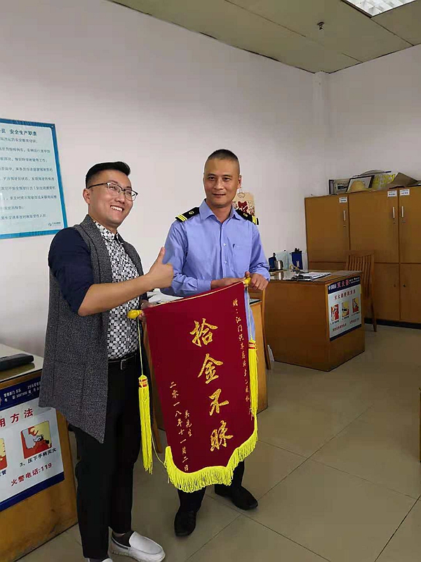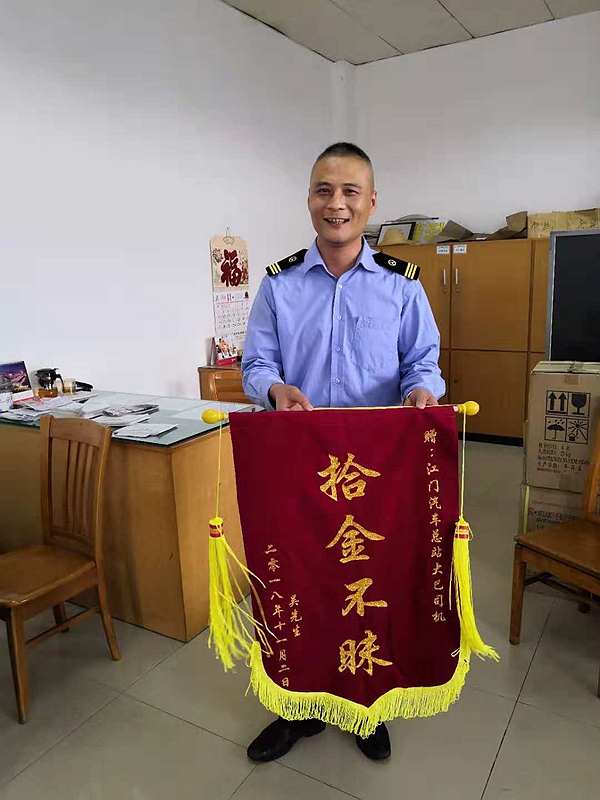 11月6日下午,一面寫有“拾金不昧”的錦旗送到了江門汽車總站駕駛員練師傅手上,送這面錦旗的是吳先生。