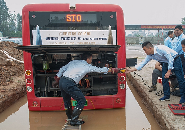 當應急救援指揮部總指揮收到事故情況報告后,立刻啟動純電車涉水應急預案。技術部、修理廠、綜合部、純電動公交車生產廠家同時開展救援工作,客車售后工程師利用檢測工具對涉水車輛進行診斷,對檢測數據進行分析判斷,確定車輛檢測正常后,駕駛員再將車輛啟動駛離涉水區域。