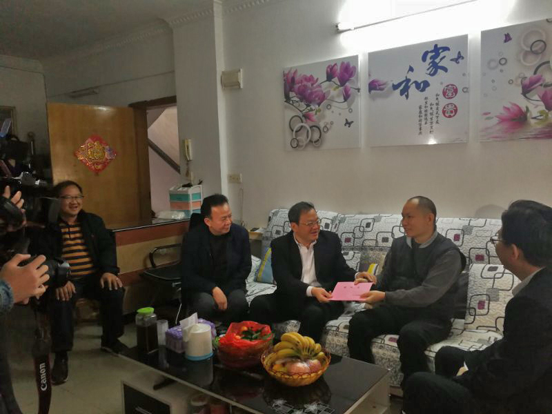 1月24日上午,江門市委副書記、市長劉毅,市委常委、組織部部長張元醒,市國資委黨委書記、主任盧國壯以及集團公司黨委書記、董事長呂俊杰、黨委副書記、工會主席馮潔文一行上門慰問江門汽車總站困難職工陳志峰。