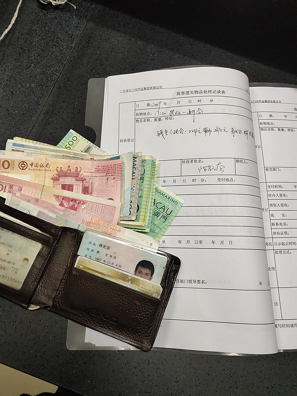 據了解,當天下午19時許,新會汽車總站駕駛員陳權套師傅到站清掃衛生時發現座椅上有一個錢包。考慮到旅客發現后肯定會心急如焚,陳師傅立刻將錢包交到問訊處登記。經清點,里面裝有人民幣224元、葡幣2670元、身份證等。大約15分鐘后,失主林先生前來問訊處找尋,當失而復得的錢包出現在眼前時,林先生都十分激動,連聲說:“真是太感謝司機了!”