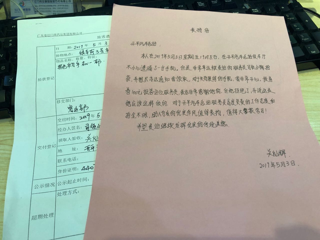 事情發生在當天下午19:20時,前來送朋友坐車的關先生一時大意將手機遺漏在開平汽車總站3號檢票口的座椅上,服務員司徒小梅發現手機后,立即上報總站保衛科,并根據手機聯系人通知關先生前往車站領取。接過失而復得的手機,關先生非常感激,握住服務員司徒小梅的手不停說著:“幸好有你”,還從錢包中掏出100元遞給服務員表示感謝,但司徒小梅婉拒了。最后,關先生還是托人向該站送來了一封表揚信,對服務員司徒小梅表示感謝。