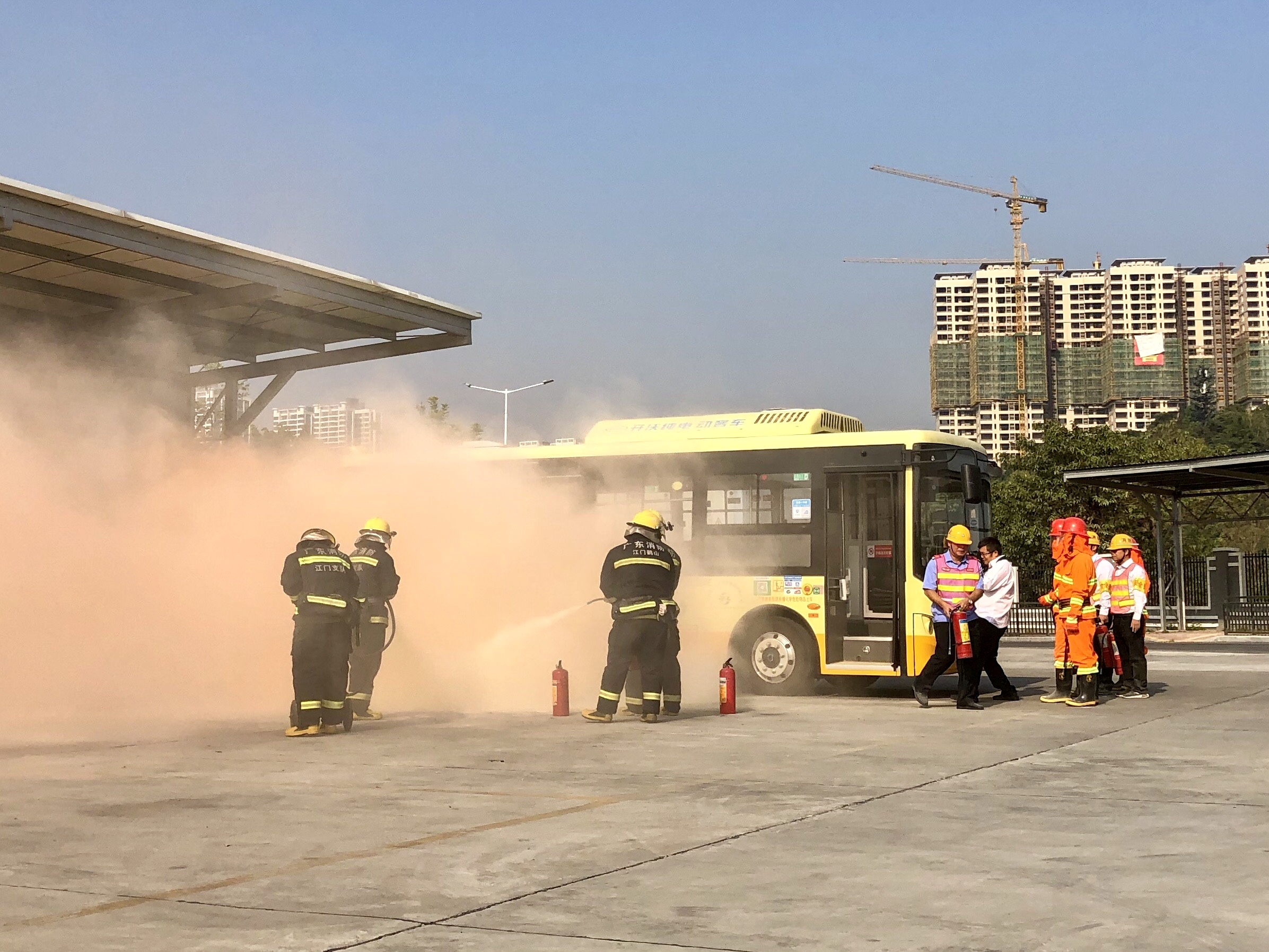 當天上午9時30分,由現場總指揮鶴山汽車總站黨委書記、總站長郭俊杰宣布演練開始,一場模擬純電動公交車在充電站充電時發生火災的消防應急救援行動正式上演。本次演練是模擬一輛純電動公交車正在鶴山公園公交站1號充電樁充電,一分鐘后車輛和充電樁突然冒煙起火,站場管理員見狀馬上切斷總電源開關,同時指揮駕駛員斷開充電樁及車輛電源并撥出充電槍,然后使用滅火器進行滅火,但由于火勢較大無法撲滅,于是站場管理員及時撥打119和上報值班領導,總指揮接到報告后立即啟動充電站消防應急救援預案。