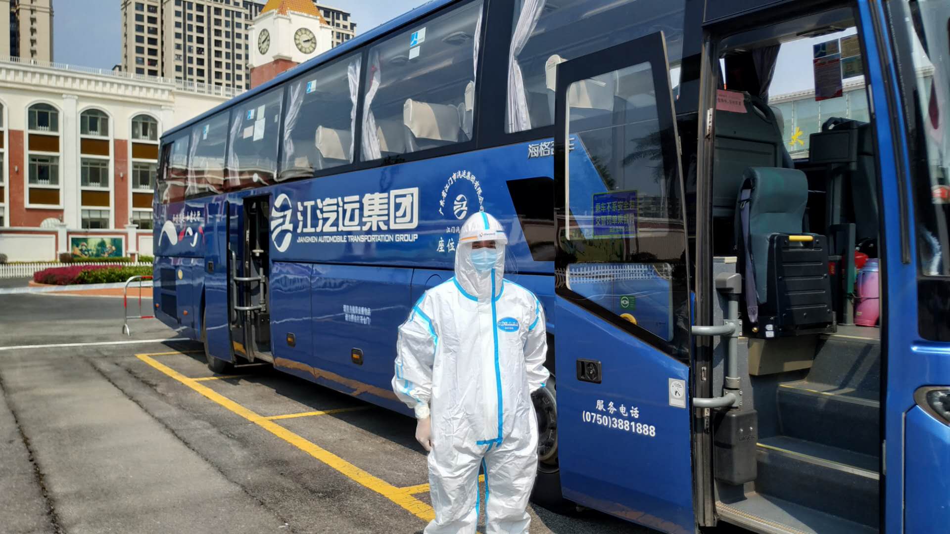 據了解,為滿足不同批次的境外歸國友人機場轉接保障運輸,江門汽車總站根據入境人員情況,合理安排商務車、小巴至大巴車等多種車型。為確保疫情防控和服務兩手抓,防疫專車在執行任務前后都會進行全面徹底的消毒及放置通風,并要求每位專車駕駛員穿戴防護服,嚴格地做好車輛消毒工序,為乘客測量體溫、安排乘客分散就坐及車輛隨車消毒,做到嚴管嚴控,實現精準防疫。其中,一位參加了4次防疫運輸任務的駕駛員說:“境外歸國友人入境后需要進行多項檢測,導致等候發車時間長,而防護服十分悶熱,常常導致汗流浹背,這些都是疫情防控交通任務的挑戰。”