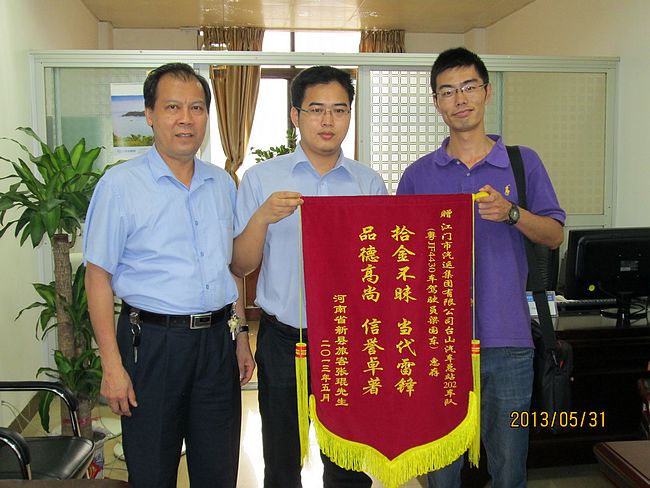 晚上24時左右,該站車隊辦管理人員接到失主的來電,經過核對,是失主河南省新縣的張琨先生,經了解,5月30日上午旅客張先生從開平乘坐臺山汽車總站客車過來臺城拜訪一位客戶,下車時不小心把錢包遺留在了車上,到了廣州之后,才發現自己身上的錢包丟了,后來一位朋友打電話聯系他,說臺山汽車總站正在打電話尋找一個錢包的失主。當張先生得知錢包在臺山車站保管著的時候,如沙漠里見到一片綠洲,激動萬分。第二天中午,張先生立刻乘車并帶上一面寫著“拾金不昧 當代雷鋒 品德高尚 信譽卓著”的錦旗來到該站車隊辦公室,經過確認,以及通過錢包里的身份證核對,該站把錢包歸還給失主張先生。 (黃鎮生 攝影報道)