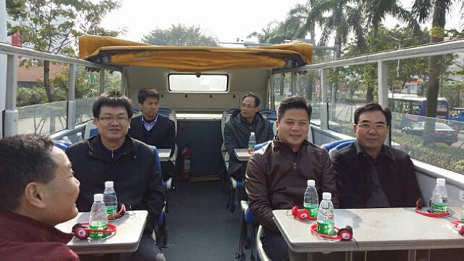 12月25日早上10時10分,市旅游局局長邵建(右二),市國企工委書記鄒敦華(右一)、副書記黃峭云(左一)等一行在集團公司董事長、黨委書記呂俊杰陪同下來到城軌江門站調研公汽公司雙層旅游觀光巴士運營情況,并登上觀光巴士親身體驗。(江門公汽)