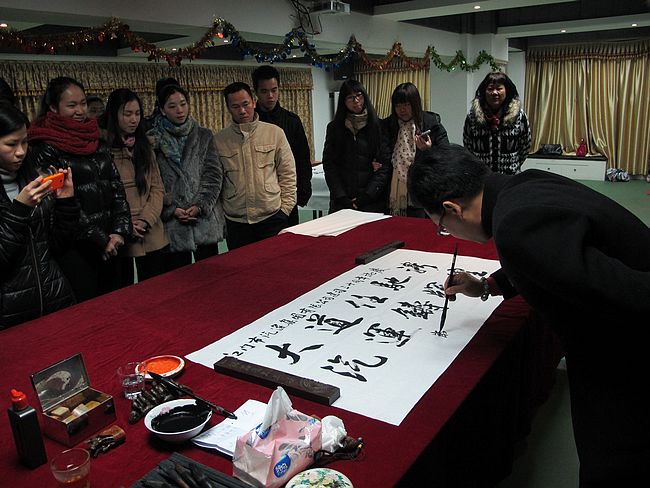 活動現場,甄偉章向員工簡述了國粹書法的發展史,寄語員工從書法學習中“悟”人生道理,用心工作,繼續發揮汽運人積極向上的精神。兩位書法家現場潑墨揮毫,《大道任馳騁 汽運鑄輝煌》、《龍馬精神》、《一馬當先》等一幅幅富有神韻之美和濃濃寓意的書法作品躍然紙上。員工一邊欣賞書法家們的運勢走筆,一邊現場臨摹起來,他們表示要好好練習書法,以傳承中國傳統文化,宣傳企業文化。(臺山汽車總站)